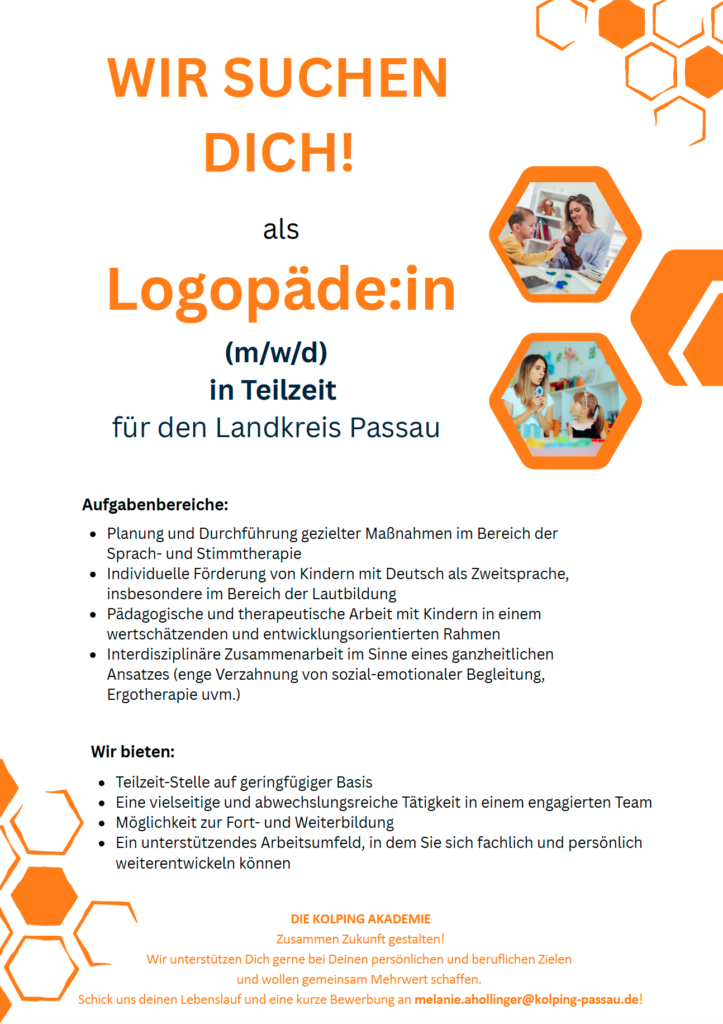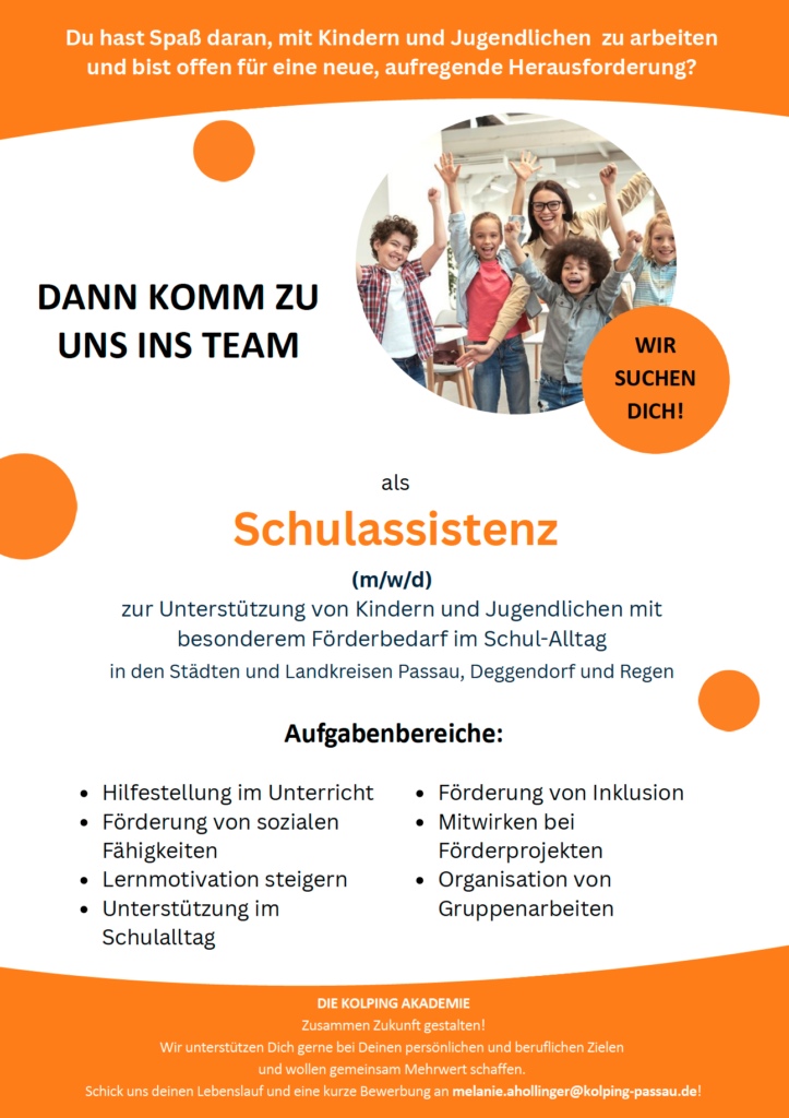 Wir freuen uns über Ihre Bewerbung auf eine unserer ausgeschriebenen Stellen, an die in der Stellenausschreibung abgebildete E-Mail-Adresse oder initiativ an folgende E-Mail-Adresse: kolping@bistum-passau.de!